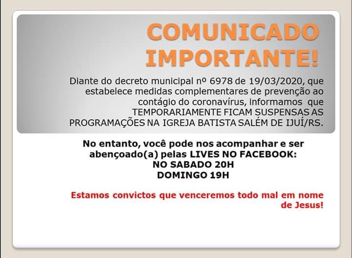 Devido à Pandemia do CORONAVIRUS – COVID 19, não estamos realizando nossos cultos em nosso templo sede e congregações porém você pode nos acompanhar através de nossa transmissão pelo Facebook.
